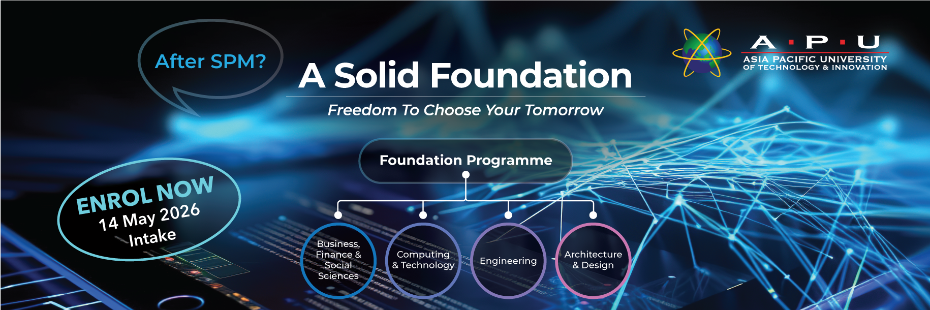 Using your SPM, ‘O’ Level or equivalent qualifications, you can progress to a wide range of internationally recognized degrees at APU in Malaysia via the APU Foundation Programme. Alternatively, you can enter the 2-year Diploma Programmes and enter directly into second year of Bachelor’s Degree.